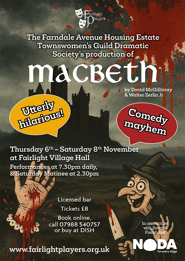 Join us for a hilariously chaotic romp as the well-meaning — if somewhat incompetent — members of the Farndale Avenue Dramatic Society take on Shakespeare’s Macbeth. Expect mishaps, mayhem, and plenty of laughs both on stage and off. Auditions in July — come and be part of the fun!